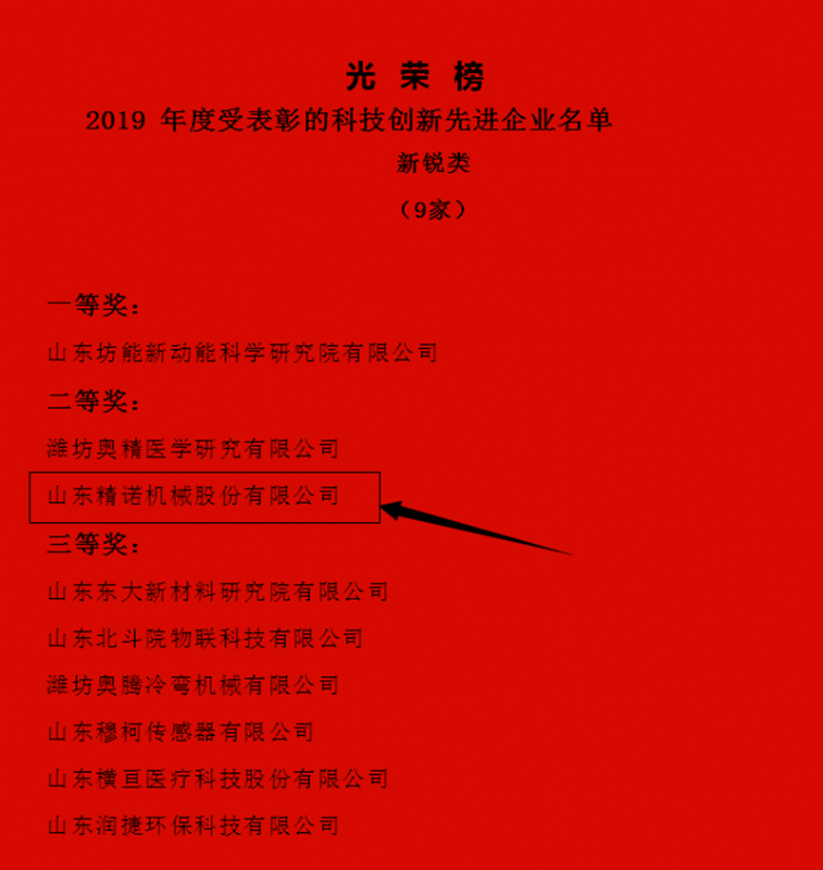 山東精諾機械股份有限公司獲得本年度科技創(chuàng)新先進企業(yè)新銳獎